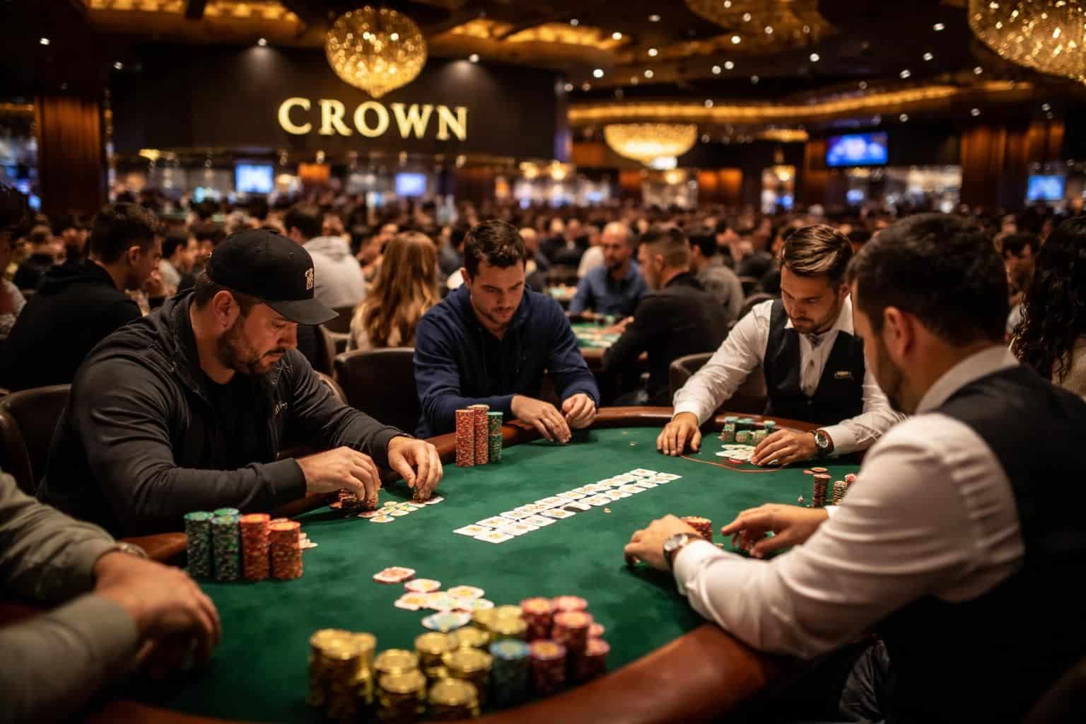 Les joueurs font la force de la salle de poker Crown. L’interaction entre les participants génère une atmosphère électrique. On observe souvent des groupes de joueurs réguliers échangeant des conseils et stratégies, renforçant ainsi la communauté conviviale qui se forme autour de ce monde compétitif.